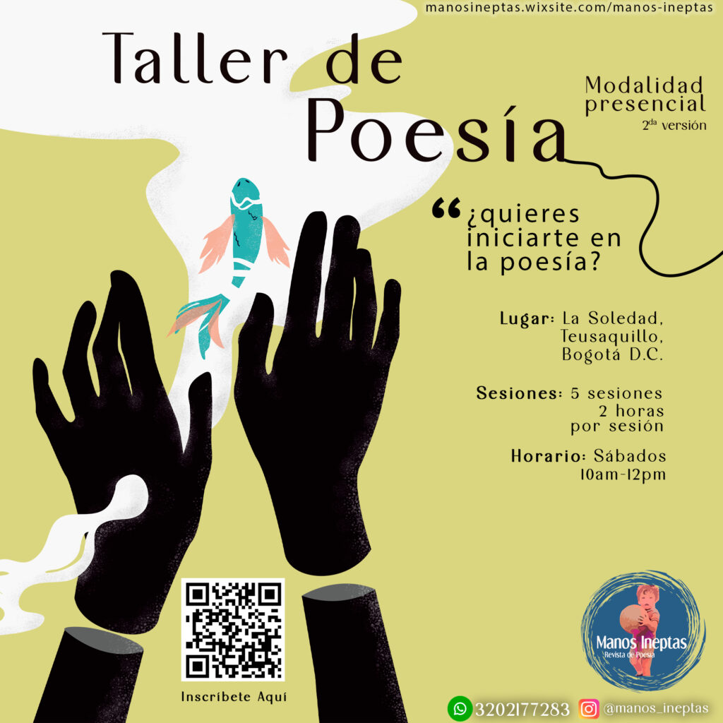 Edwin Martin ha participado como director en los talleres de escritura de la Revista de Poesía Manos Ineptas. Si te interesa participar en estos talleres, que se ofrecen en modalidad virtual y presencial en la ciudad de Bogotá D. C., te invitamos a conocer más información e inscribirte a través del siguiente enlace.